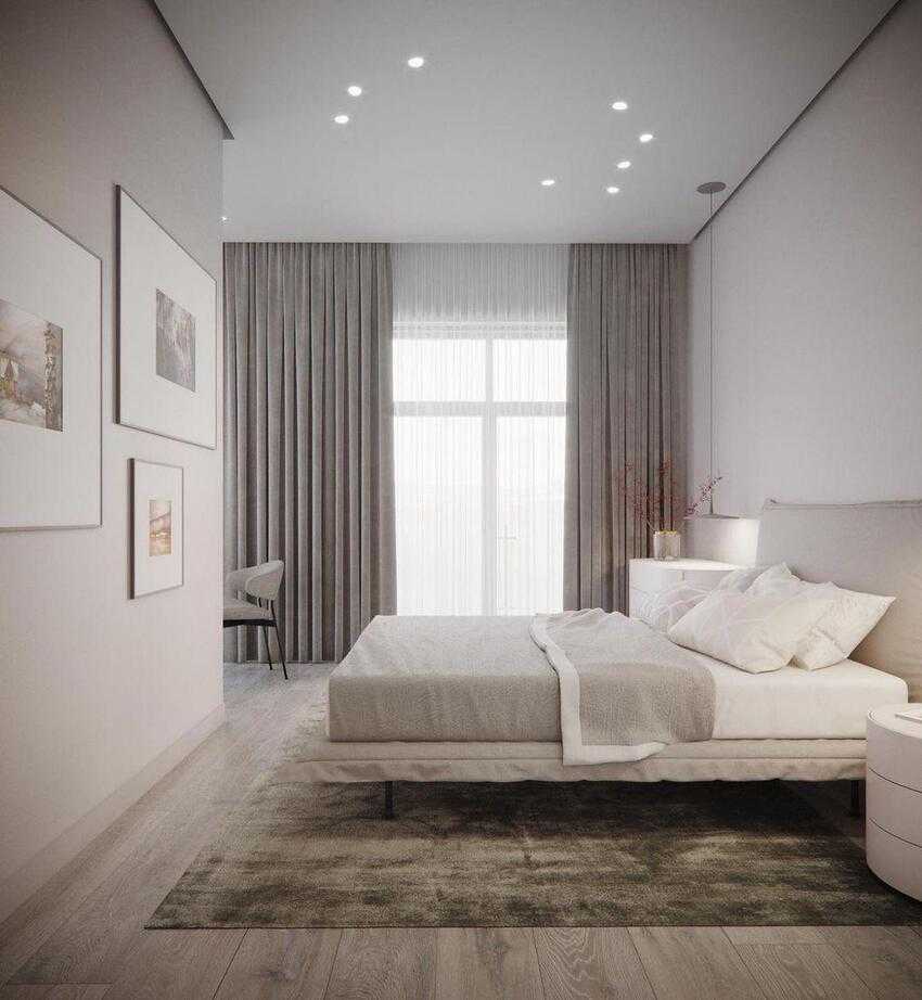Драпировки подбираются в одном стиле, сочетающиеся друг с другом. Шторы могут контрастировать с обоями или совпадать с ними по тону, если так задумано. Покрывало выбирается такого же цвета, как накидки на креслах. Ковер нужен большой – от каждой из его сторон до стен оставляют всего 15-20 см. – это помогает расширить пространство, объединив все предметы меблировки. Одну из зон можно выделить ковриком меньшего размера.