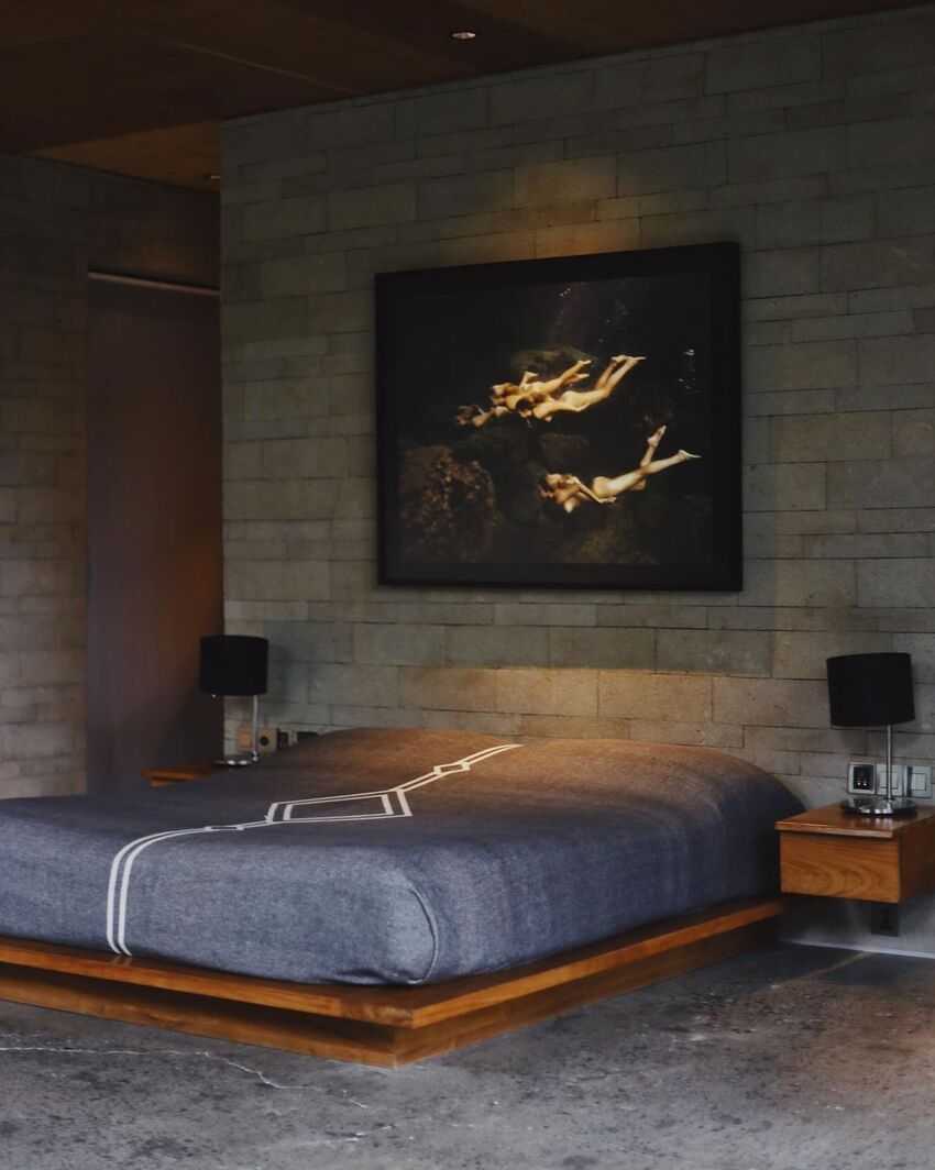 Часто устанавливают только одну большую кровать по центру стены. Ножки у нее могут вовсе отсутствовать.