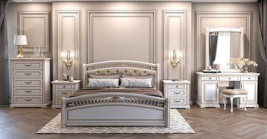 Центр композиции — высокая кровать из натурального дерева с инкрустацией или резьбой. Окружают ее другие предметы мебели в классическом стиле: тумбочки и комоды, стулья и бельевые шкафы, кресла, кушетки, козетки, диваны.