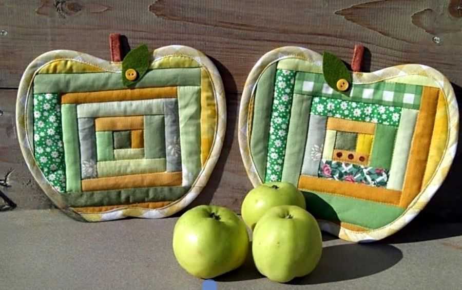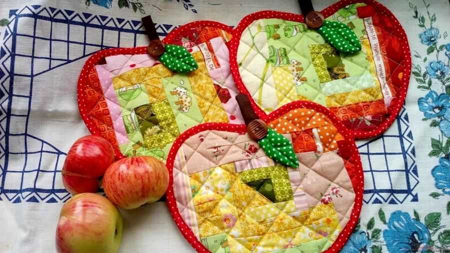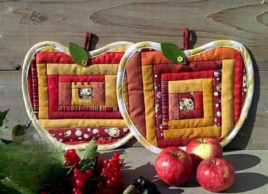 Прихватки яблоко для кухни в технике лоскутного шитья «Колодец», когда полоски ткани пришиваются по кругу.