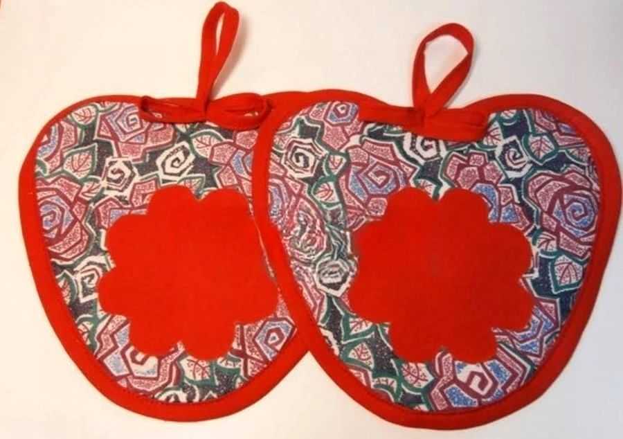 Прихватки яблоко для кухни в красных тонах своими руками. Показана одна прихватка снаружи и с изнанки.