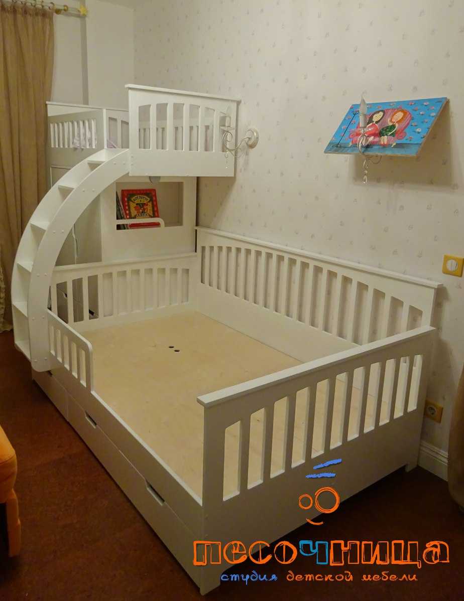 Не всегда кровать была предназначена для двоих детей. Есть двухъярусные кровати-чердаки и кровати-замки, когда спальное место расположено сверху, а внизу находятся письменный стол и шкафы. Это устойчивая модель, не нужно беспокоиться за ребенка, особенно если ему уже больше 6 лет. Кроме того, некоторые модели сочетают в себе два яруса и выкатной механизм — например, кровати для троих детей.