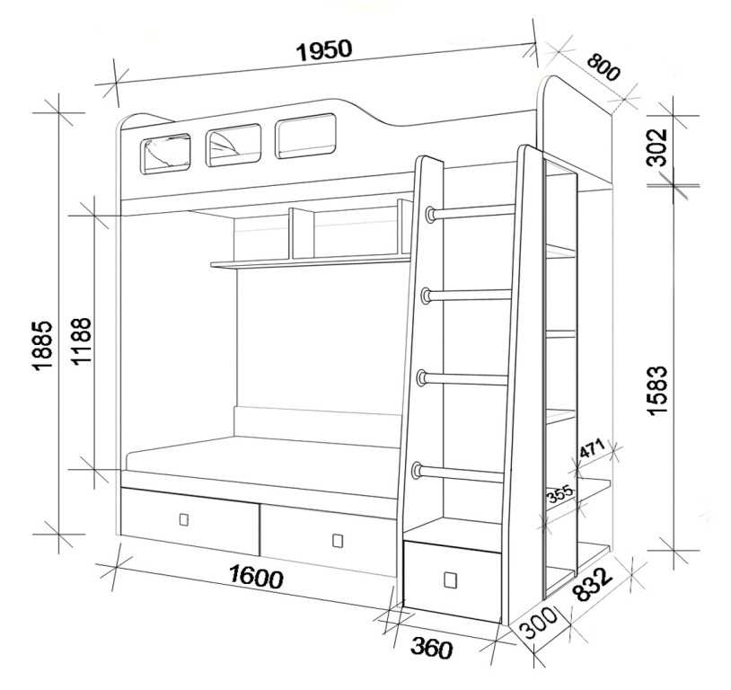 Нижний ярус тоже должен быть просторным. Ниже мы предлагаем подробные чертежи классической двухъярусной кровати, рассчитанной на комнату с потолком высотой в 2,5 м. Толщина матраса в кроватках, которые мы предлагаем, около 20 см.