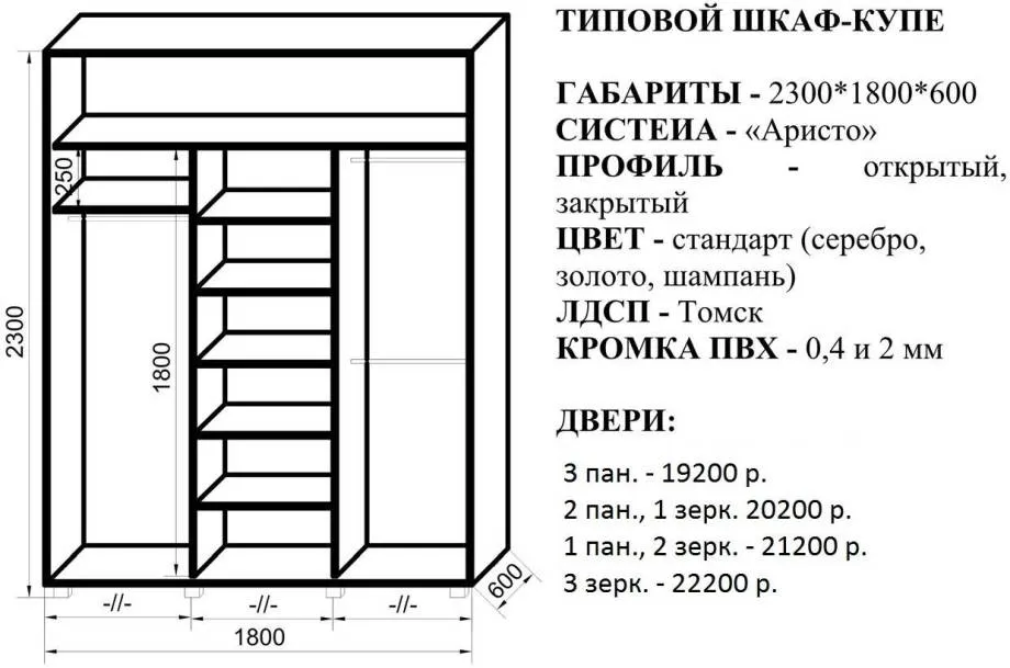 Чертеж шкафа-купе с удобными полками