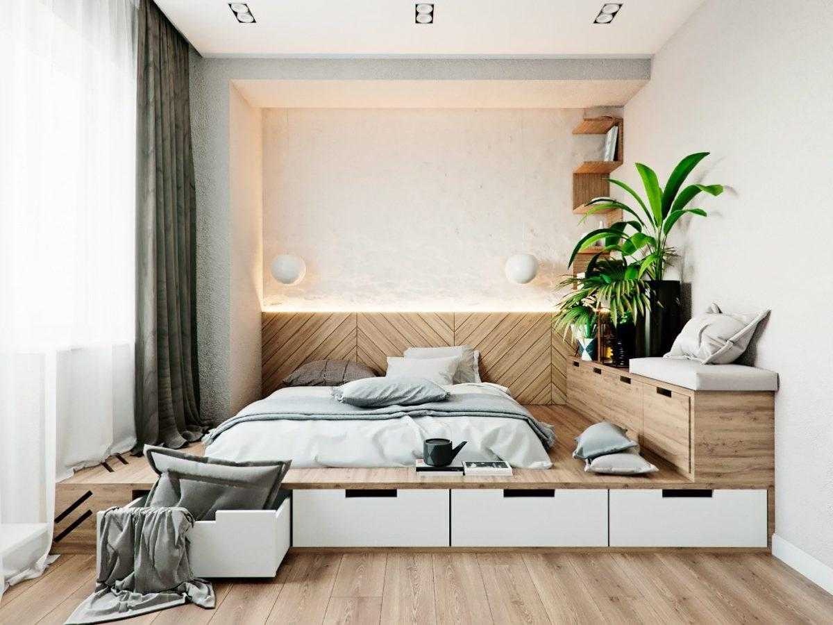 Установка кровати с подиумом со встроенными бельевыми ящиками выгодно экономит пространство, может использоваться в зонировании. Идеальный вариант планировки жилого помещения для современных квартир, имеющих отгороженный от прихожей участок площади.