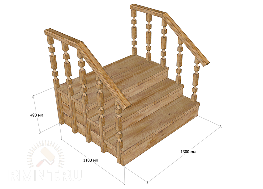 Размеры рассматриваемого нами крыльца: высота — 490 мм, ширина — 1300 мм, совокупная длина ступеней лестничного марша — 1100 мм.