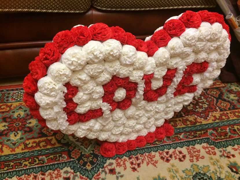 - Приклейте цветочки на каркас, используя момент универсальный. Внешний каркас цифры оклейте красными цветочками, а внутренний – белыми.