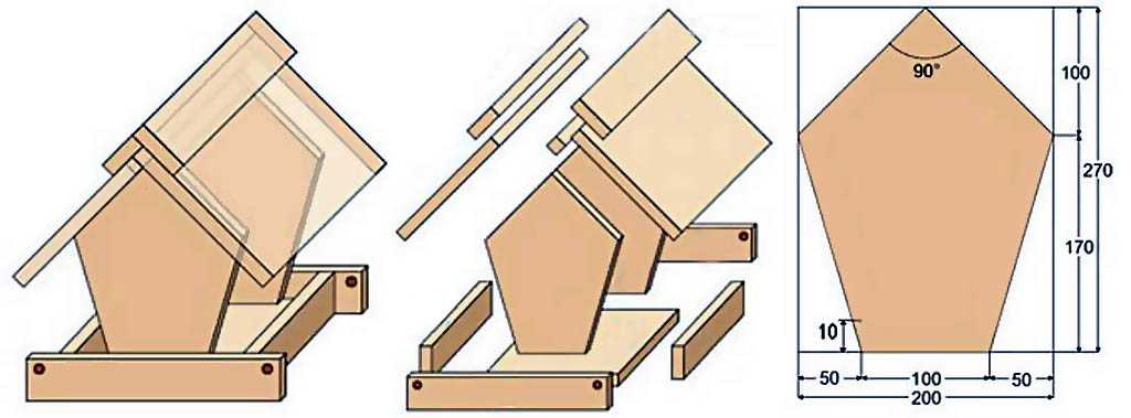 Чтобы собрать конструкцию в виде домика, нужно предварительно разработать чертежи для кормушки для птиц. Своими руками собрать ее тогда будет гораздо легче. Нарисуйте схематически будущую кормушку. Затем проработайте каждую ее деталь.