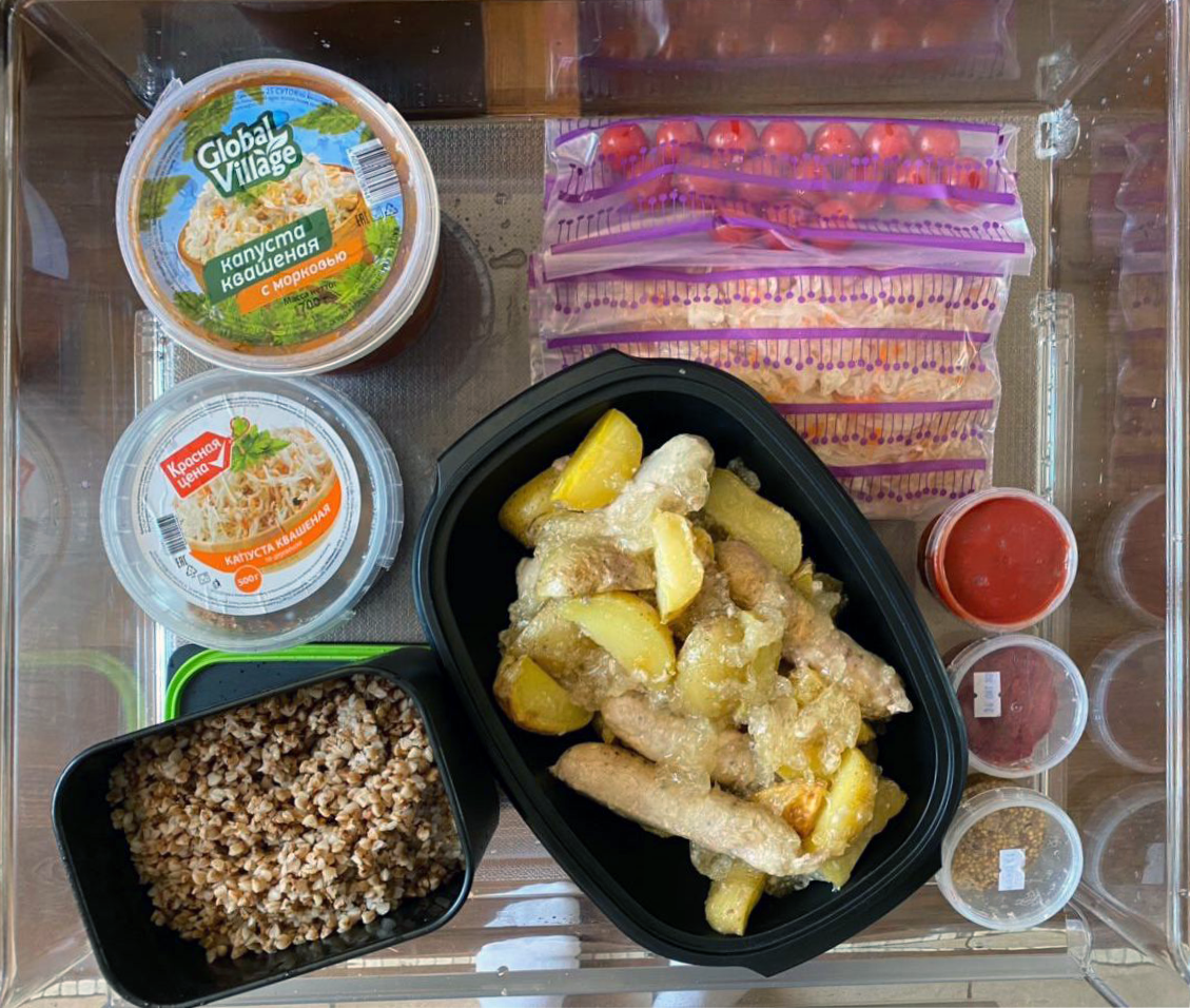 Готовые блюда переложим в контейнеры. Курицу и гречку в банки от капусты, остальное — в те контейнеры, что есть дома. Идеально было бы использовать прозрачные контейнеры, но дома есть только черные, а покупать новые не стоит — это неэкологично.