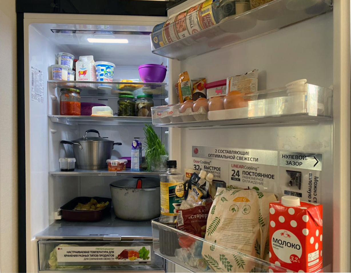 Молоко и яйца хранятся неправильно, готовая еда в кастрюлях занимает много места, в соусах бардак
