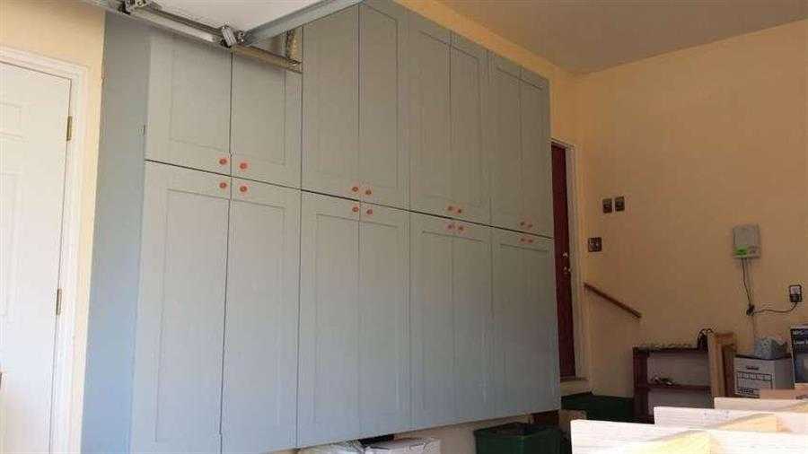 На левом конце шкафа предусмотрена верхняя раздвижная дверь, чтобы не мешать воротам гаража.