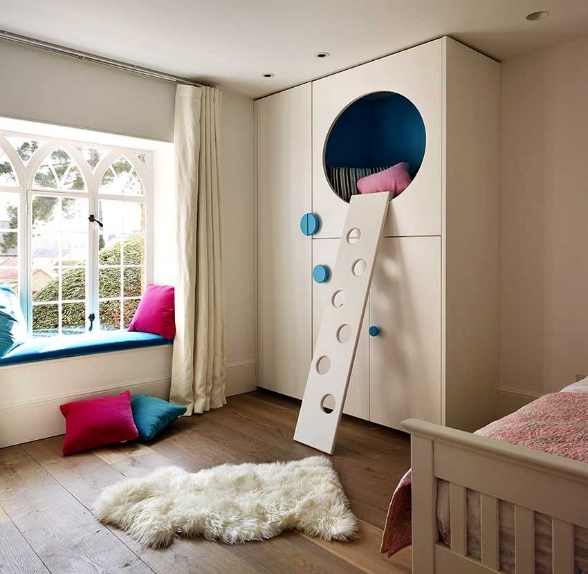 Интересным дизайнерским воплощением и хорошей возможностью реально сэкономить площадь помещения являются угловые шкафы в детскую. Чаще они имеют пятиугольную форму. Наличие угловой части увеличивает внутреннее пространство шкафа, позволяя разместить в нем большое количество предметов.