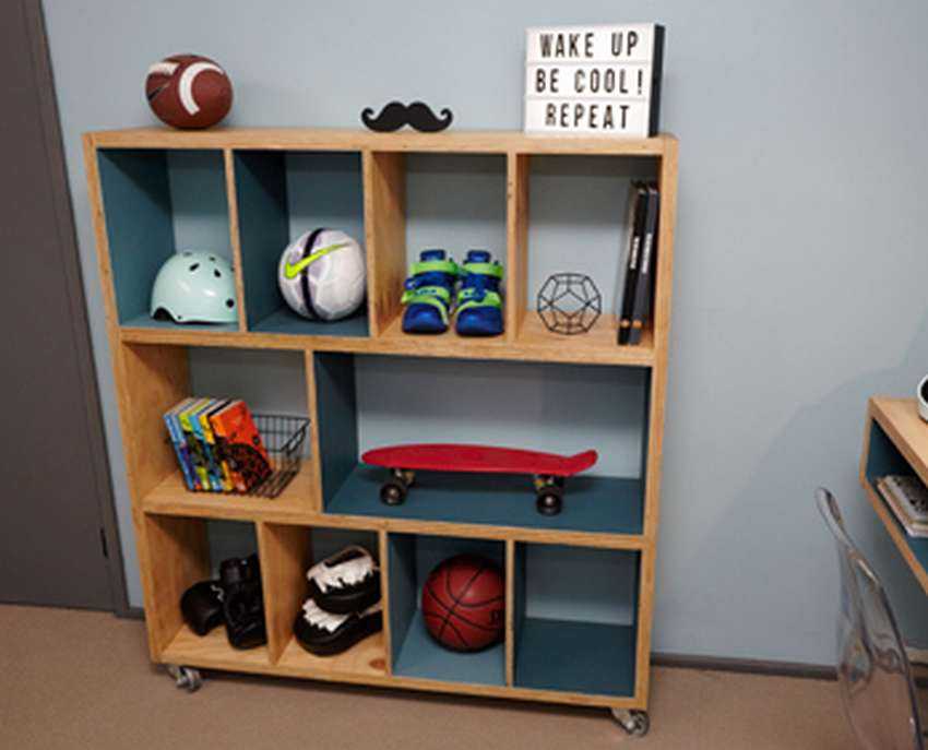 Это удобная мобильная конструкция из блоков отлично смотрится и может быть спроектирована в соответствии с вашим пространством. Здесь показано, как сделать детский шкаф своими руками, а также какие инструменты и материалы вам понадобятся. Выбрав размер блока, который вы собираетесь сделать, распилите фанеру по необходимым размерам. Для рамы распилите обои размером 600 мм x 2250 мм пополам, чтобы сделать четыре штуки размером 300 мм x 2250 мм. Затем разрежьте два из них на 1330 мм для боков и два на 1200 мм для верхней и нижней части. Для полки и разделителей отрежьте 2400 мм x 1200 мм x 17 мм слой на 300 мм штук по длине 2400 мм, чтобы получилось восемь штук. Затем сделайте раму. Убедитесь, что все углы ровные и просверлите отверстия, чтобы соединить детали. Используйте 50-мм шурупы.Закрепите первую полку и разделители. Начиная снизу, установите одну из 1200 мм полок в раму. Пробел должен равномерно проходить вдоль нижней части рамки.