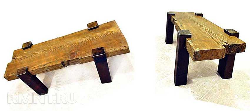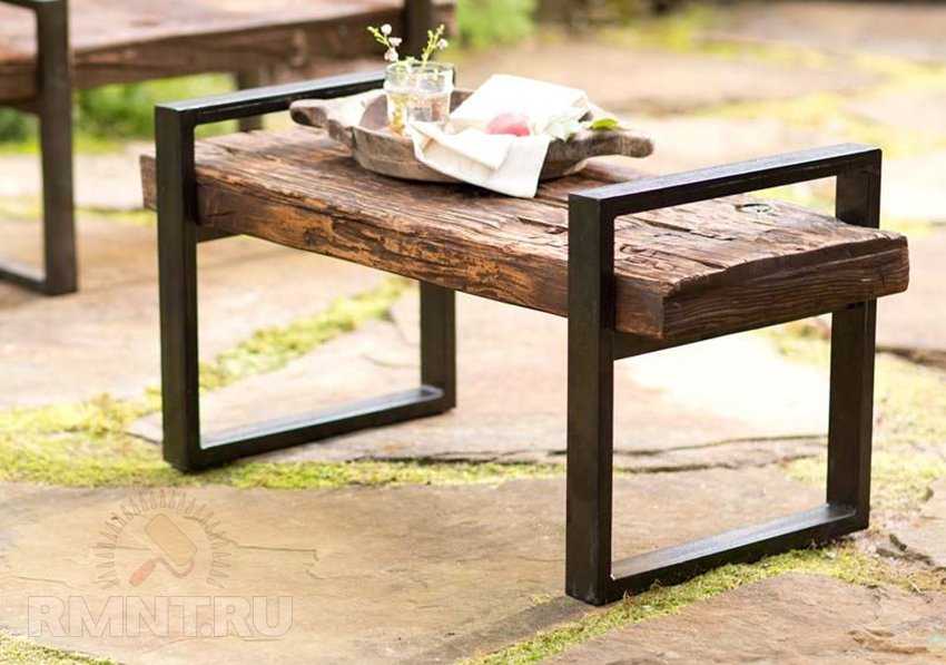 Можно сварить из профильной трубы две боковины в виде буквы «Н», а деревянное сиденье из массива будет служить еще и «ребром жесткости».
