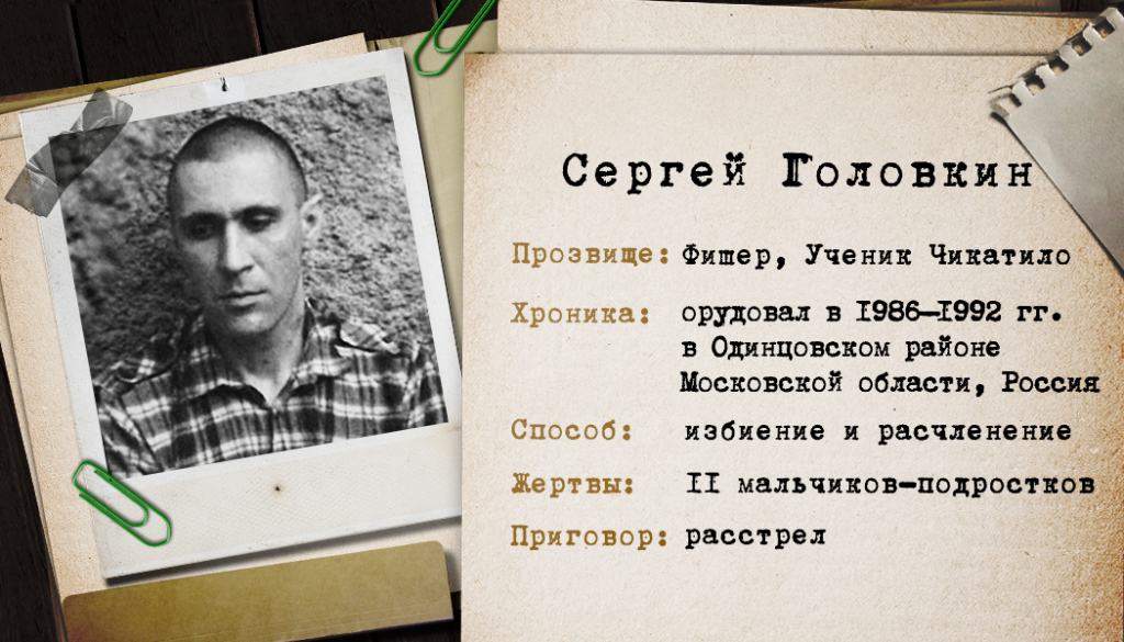 Первую жертву он подкараулил на улице и повесил. Молодой человек чудом выжил и позже опознал маньяка. Но до этого Головкин успел убить 11 мальчиков. Он насиловал, избивал и расчленял трупы в лесу или гараже. На одном из тел насчитали 35 ножевых ранений. После задержания Головкин полностью отрицал причастность к этим жестоким преступлениям. Разговорить его смог сокамерник. Фишера расстреляли в 1996-м.