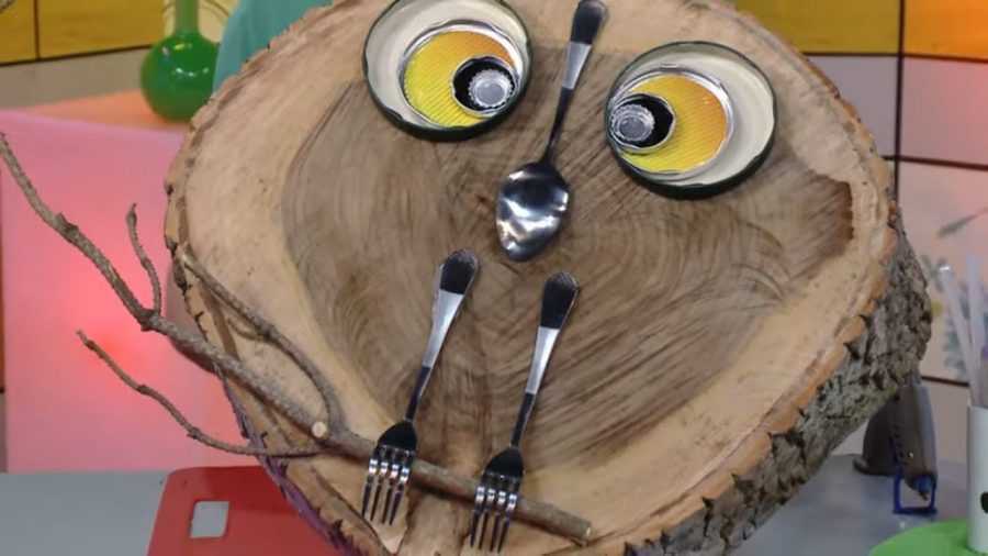 Из бревна может получиться большая сова, а из спилов стволов и веток — экземпляр поменьше. Даже маленькая фигурка будет смотреться очень колоритно, так что гнаться за размером вовсе не обязательно. Помимо этого понадобятся кора, ветки, шишки, а также пуговицы, пластилин, пушистая проволока.