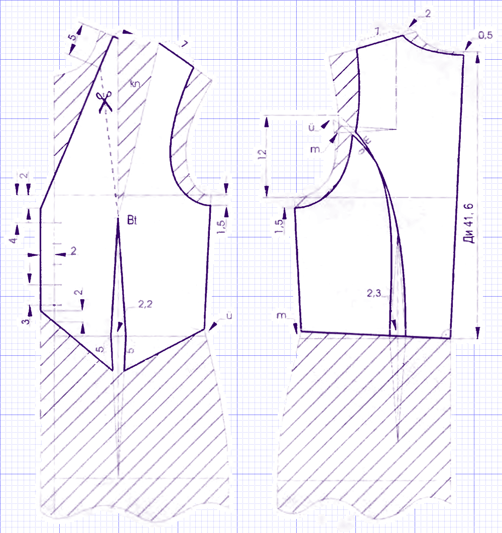 Особенность – легкая драпировка внизу на полочке. Схематическое изображение показано на рисунке. Чтобы ее выкроить, нужно разрезать нижнюю деталь выкройки по вертикальным линиям и раздвинуть на необходимую ширину.