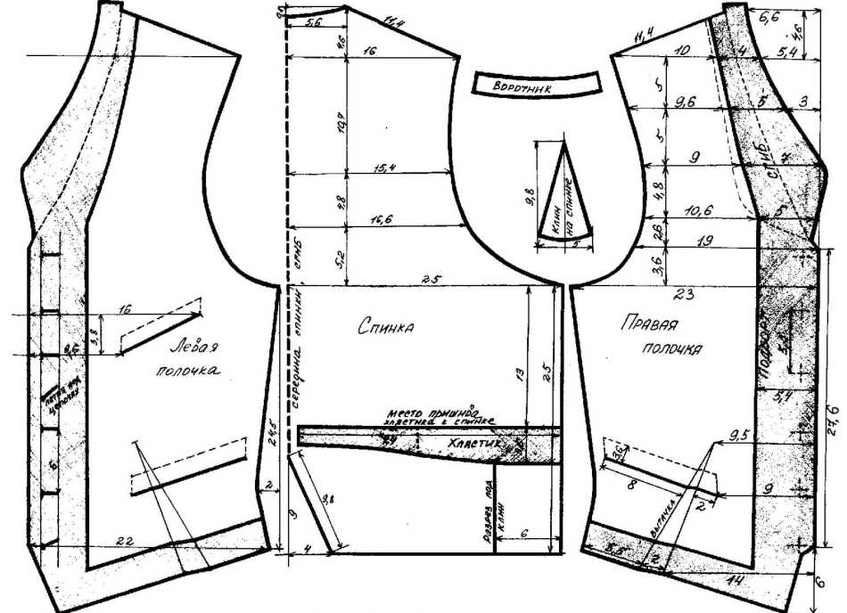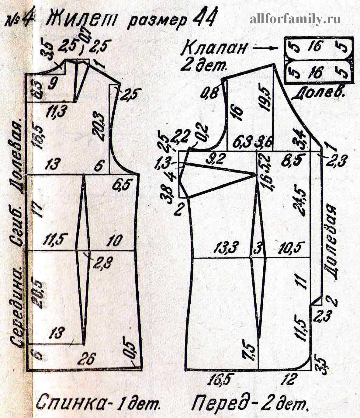 Как и шитье любого другого вида одежды, процесс пошива жилета начинается с построения выкройки. Для ее создания используется выкройка основы платья или жакета, пальто. В отличие от контуров базовой выкройки, при моделировании жилета, горловина спинки углубляется на 2 см, проймы полочек и спинки — на 1,5 см. Вытачки или рельефы, местоположение карманов, длина изделия, форма горловины и линии низа моделируются в зависимости от выбранного фасона будущего изделия. Ниже представлены варианты выкроек жилетов различной сложности для мужчин и женщин.