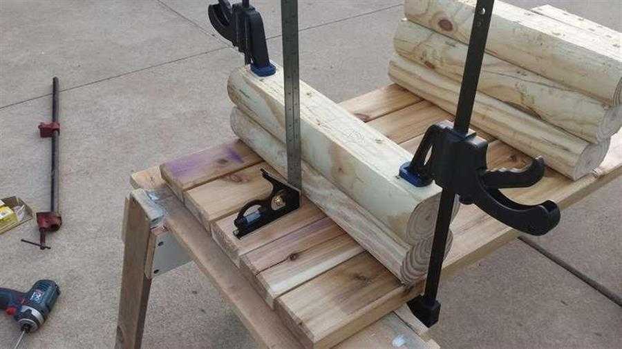 - Если нет досок нужных размеров, раскроить древесину на заготовки, используя электролобзик или торцовочную пилу. Каждый полученный элемент тщательно обработать, а заготовки для спинки и сиденья отшлифовывать. По торцам досок пройтись электрорубанком, в идеале придавая им закругленную форму.