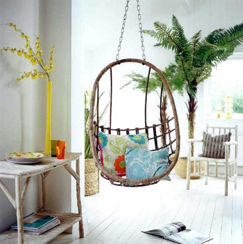 Такое кресло можно разместить в саду, подвесив к толстой ветке раскидистого дерева. Если же вы планируете подвесное кресло сделать функциональным украшением веранды или беседки, потребуется соорудить подвесную конструкцию.
