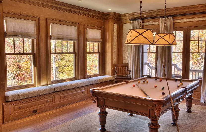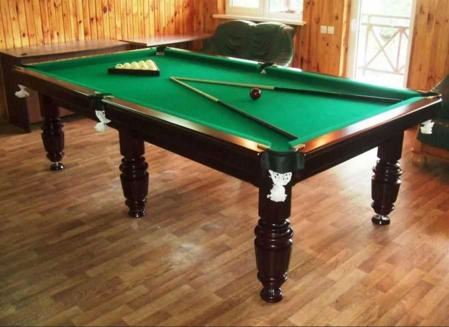 Важен микроклимат, чтобы это была сухая комната с невысокой температурой, без избыточной влажности, что губительно для натуральной древесины. Расстояние от стен до бильярдного стола должно быть больше длины одного кия – все для комфортной игры.