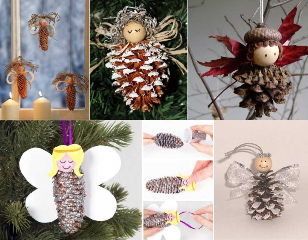 Ещё один вариант достаточно простой поделки – ангелочек. С этой целью берётся шишка, которая образует тело фигурки. На неё наматывается белая мишура, а также к ней крепятся крылья, изготовленные из мишуры и проволоки. Для головы ангела можно использовать колпачок от фломастера или любую подходящую деталь из пластмассы.