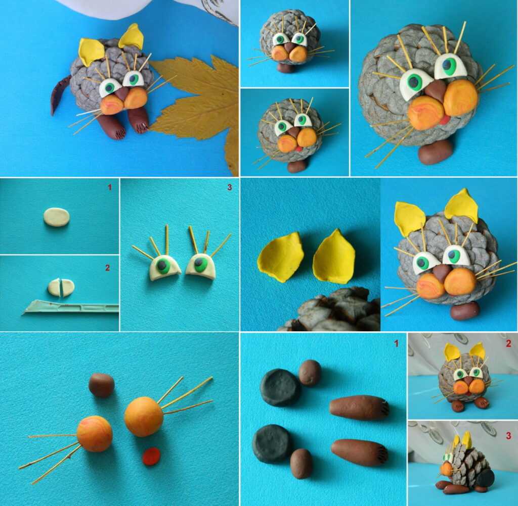 Если в квартире есть старые игрушки, можно некоторым их деталькам дать вторую жизнь и применить их для поделок. А также в качестве декора, как и для птичек, используют различный материал. Ребенок с удовольствием сделает животных из нескольких шишек, они легко соединяются между собой при помощи горячего клея.