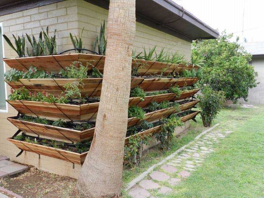 Для небольшой площади подойдет вертикальная ориентация посадки. В этом случае можно воспользоваться ступенчатой конструкцией, на которой будут размещаться ящики с почвой. Подобные сооружения применяются для выращивания фасоли, гороха или огурцов. Как вариант, попробуйте арки и лесенки.