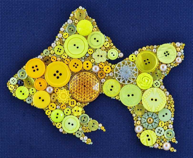 Из пуговиц получаются яркие, веселые рыбки на морском дне.