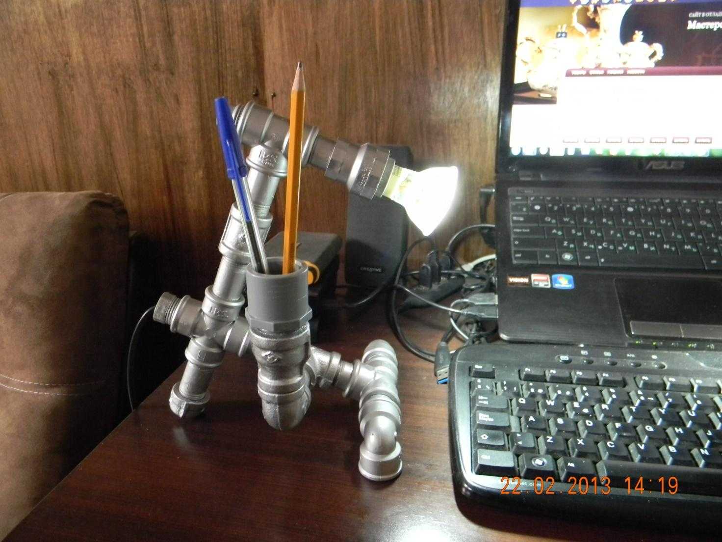 В стиле лофт светильник из водопроводных труб в виде настольного решения может стать уютным ночником или на рабочем пространстве вдохновляющим атрибутом.