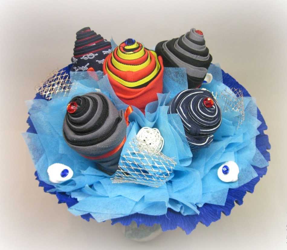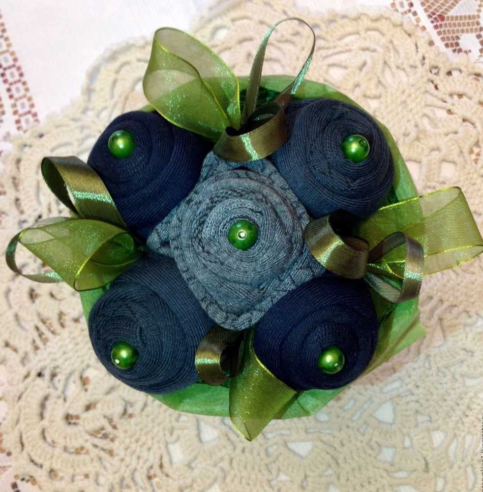 Выше мы говорили о том, что можно просто обмотать трусы вокруг декоративных стеблей, создав таким образом схожесть с бутонами. Можно же поступить и другим образом, создав более сложную композицию, включающую носки: