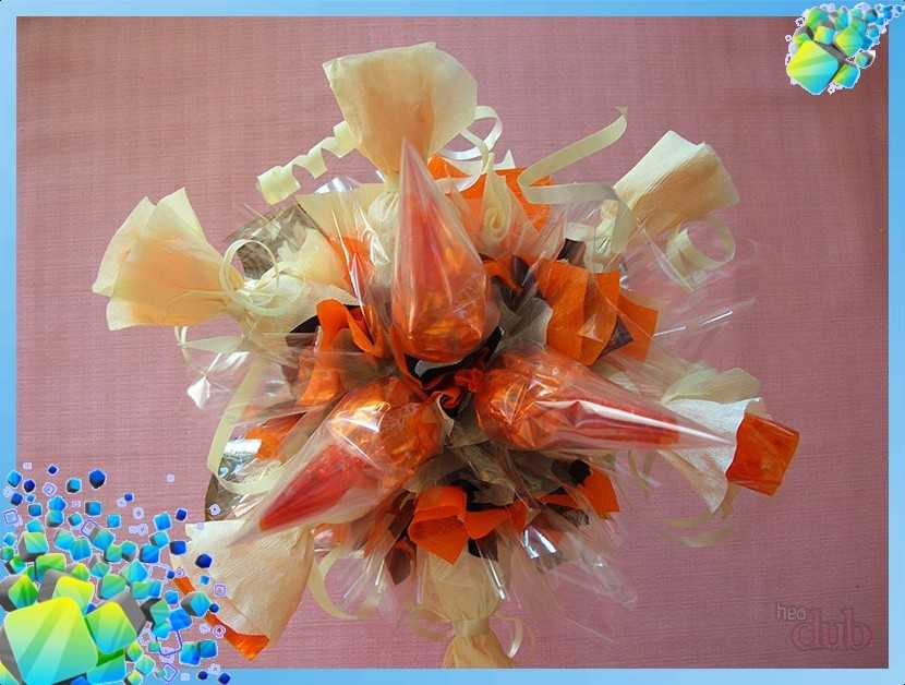 если ингредиентов много, то удобнее будет поместить их в корзину. Такой букет будет не менее красивым. При том, что большое количество элементов делают конструкцию тяжелой, корзину перенести будет проще;