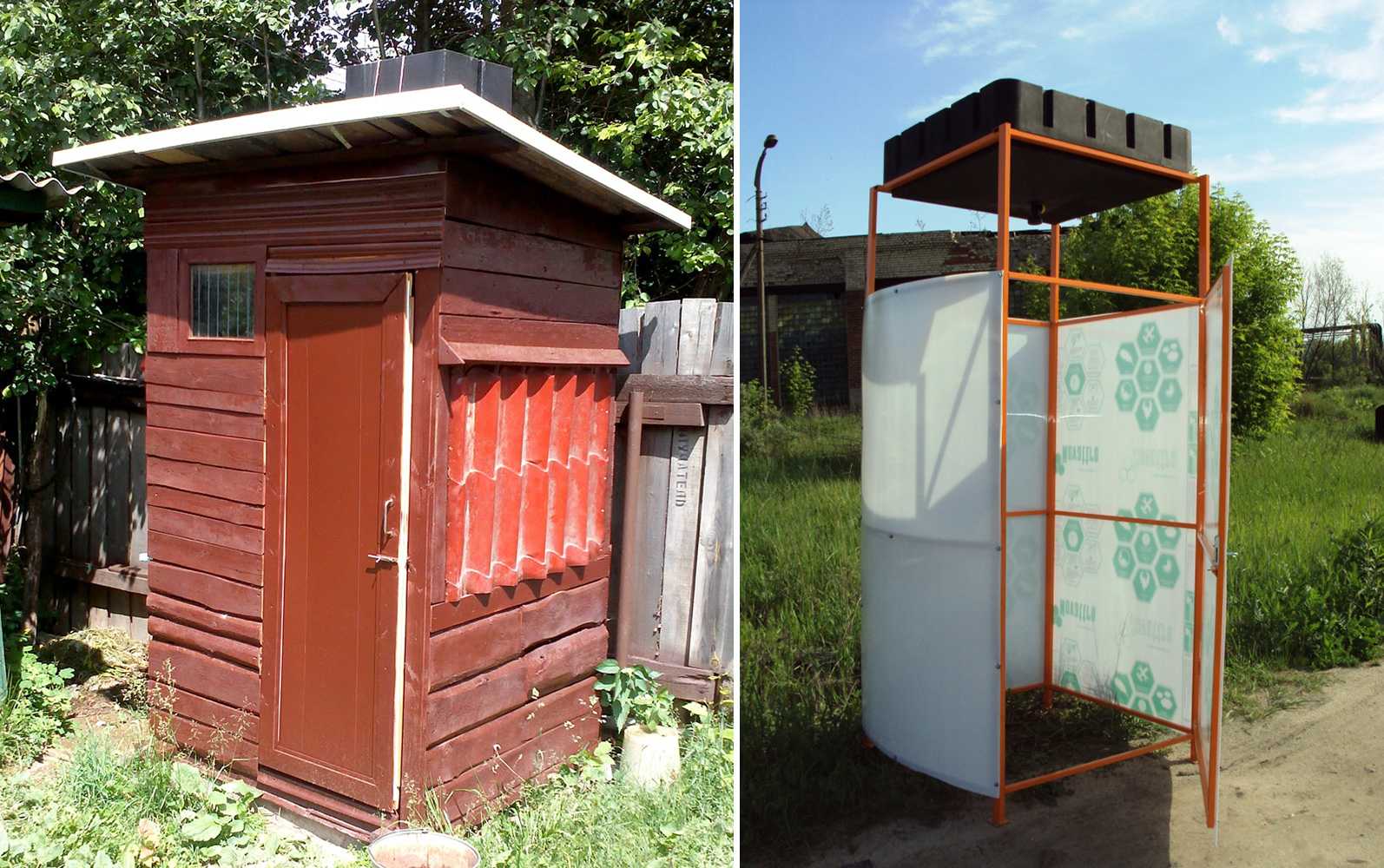 - Более сложная конструкция представляет собой небольшую кабинку из подручных материалов, к примеру, натянутого на металлический или деревянный каркас брезента, с выведенным наружу баком, который может нагреваться на солнце. Баки преимущественно используются пластиковые и металлические.