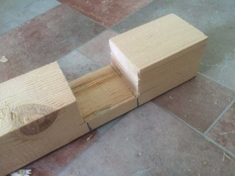 На концах делаем подрезы брусов . Получаем на одной заготовке выступающий средний край — шип, на другой – нишу, углубление (ширина – равна ширине бруса). Промазываем клеем, соединяем детали между собой так, чтобы получился прямоугольный короб.