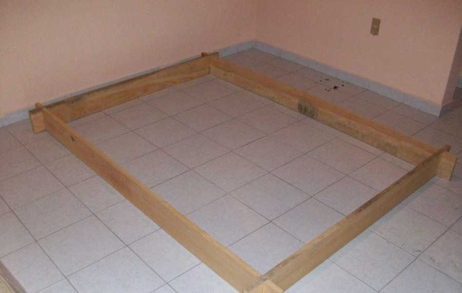 Для этого на полу выкладывается короб налаживанием заранее подпиленных по размеру брусьев в виде прямоугольника, торцы которого промазываются клеем, сцепляются саморезами.