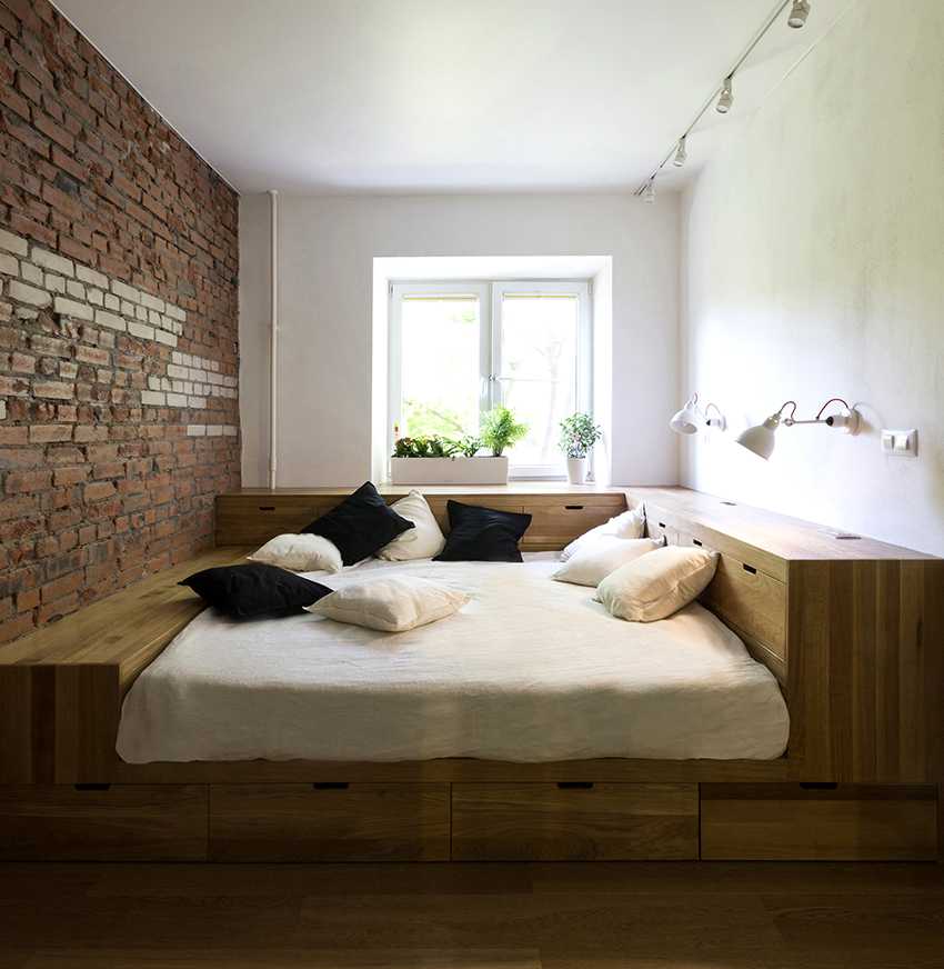 В последнее время создание подиумов для кровати довольно распространенное увлечение среди владельцев маленьких квартир. И это понятно, ведь в этом случае убивается два зайца сразу, и спальное место получается довольно просторным и система хранения готова.