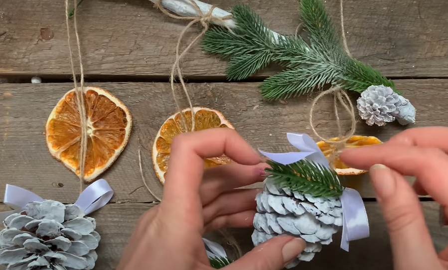- Снизу приклеиваем бечевку с сушеным апельсином и шишкой.