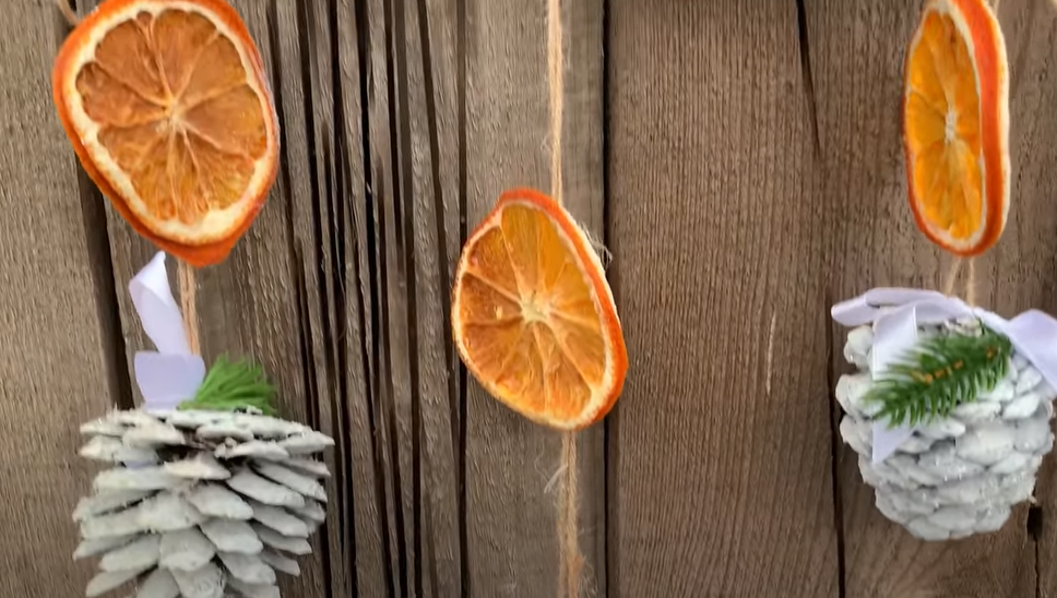 - На бечевку приклеиваем сушеные апельсины, которые придадут не только яркости, но и подарят аромат.