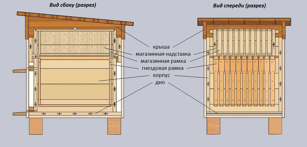 Чертеж. Устройство однокорпусного улья с двумя магазинамислева — разрез вдоль рамок; справа — разрез поперек рамок.