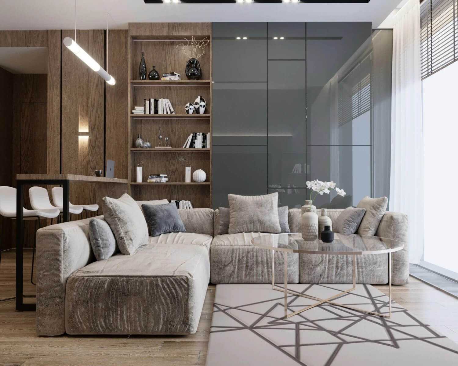 Часть стеллажа можно оставить открытым, расставив на полках с книгами дополнительные декоративные элементы, а часть скрыть. Интерьер в Москва-Сити “Neva Towers”, дизайнер Елена Нижегородова