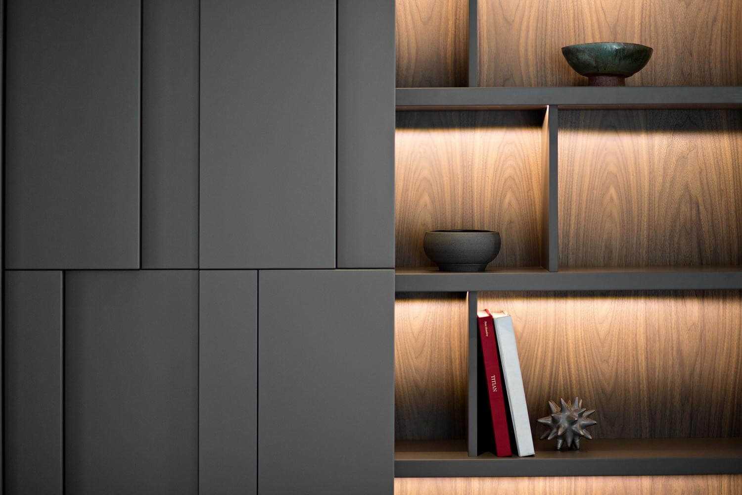 Книжная пыль — сильнейший аллерген. Чем больше книг, тем больше пыли, тем сложнее и дольше уборка. Самое надёжное решение в этом случае — отдать предпочтение закрытым, остеклённым полкам и шкафам. Если библиотека расположена в небольшой комнате, можно использовать откатные, а не распашные дверцы.