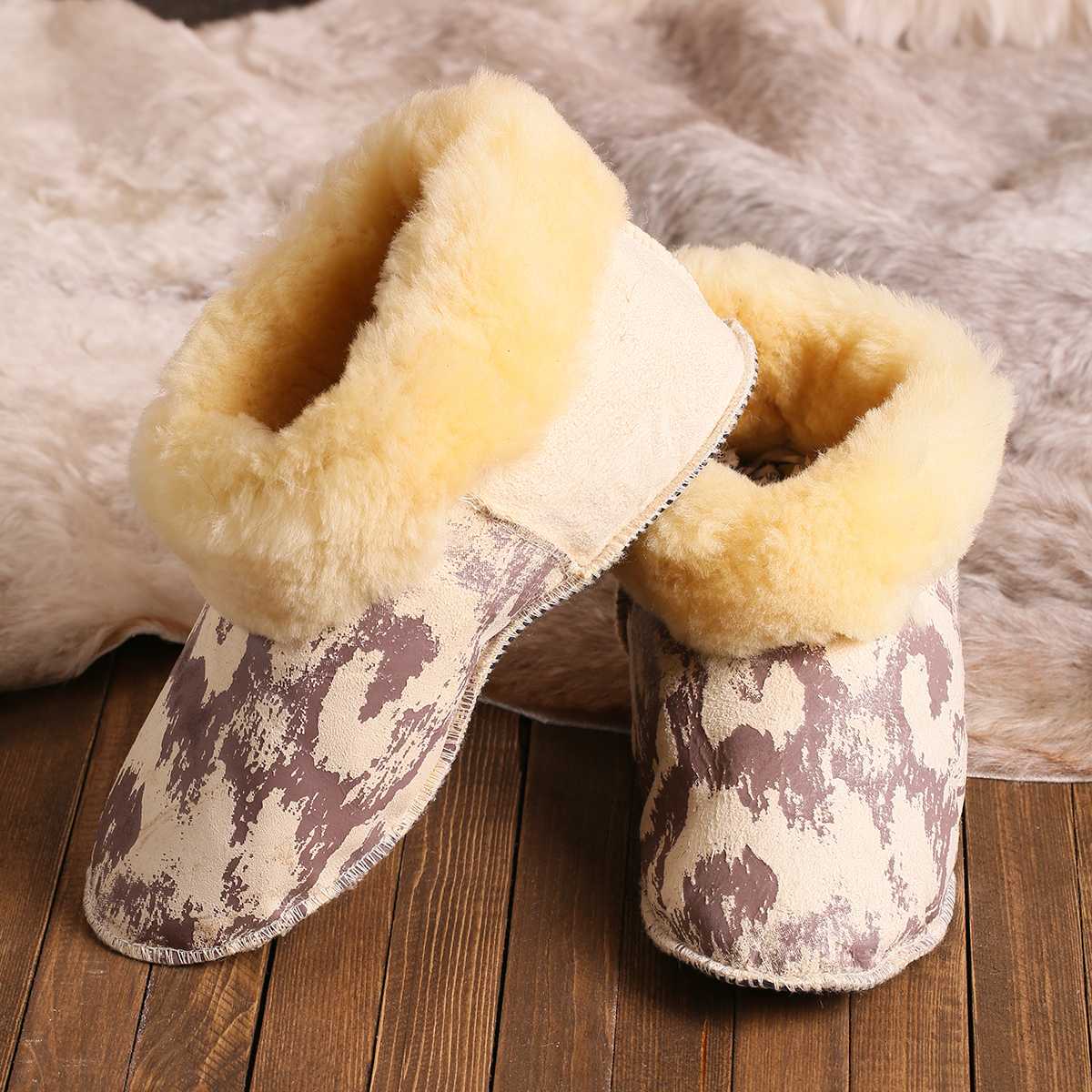 При пошиве теплой обуви, для голенища можно использовать рукава от шубы. Выкройку подошвы можно сделать, приложив любую стельку из ваших сапожек. Если вы не хотите возиться с созданием выкроек, можете взять свои старые мягкие мокасины и обшить их овчиной, как на фото.