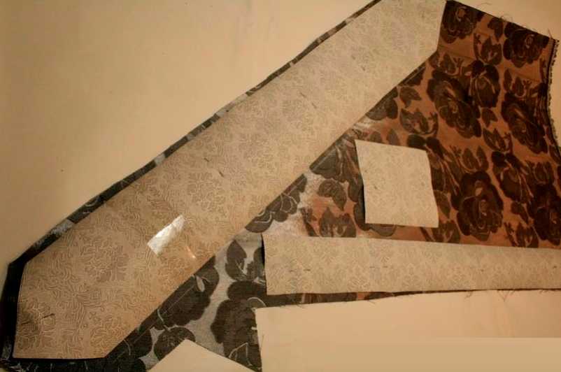 Кроме основной тканной детали потребуется еще несколько обтачек. Одна пойдет на нижний край, другая на верхний. Это нижний уголок с частью галстука минимум тридцать сантиметров. Для прокладки следует выкроить несколько шерстяных деталей и сметать их с помощью длинных стежков, без клеевых прокладок. Далее сделать обработку по образу однослойной детали. Можно применить для этого флизелин. Из шелка должна быть сделана полоска по ширине изделия минус несколько сантиметров. В готовом виде должна иметь ширину в 3 сантиметра. Потом все выкройки нужно отутюжить.