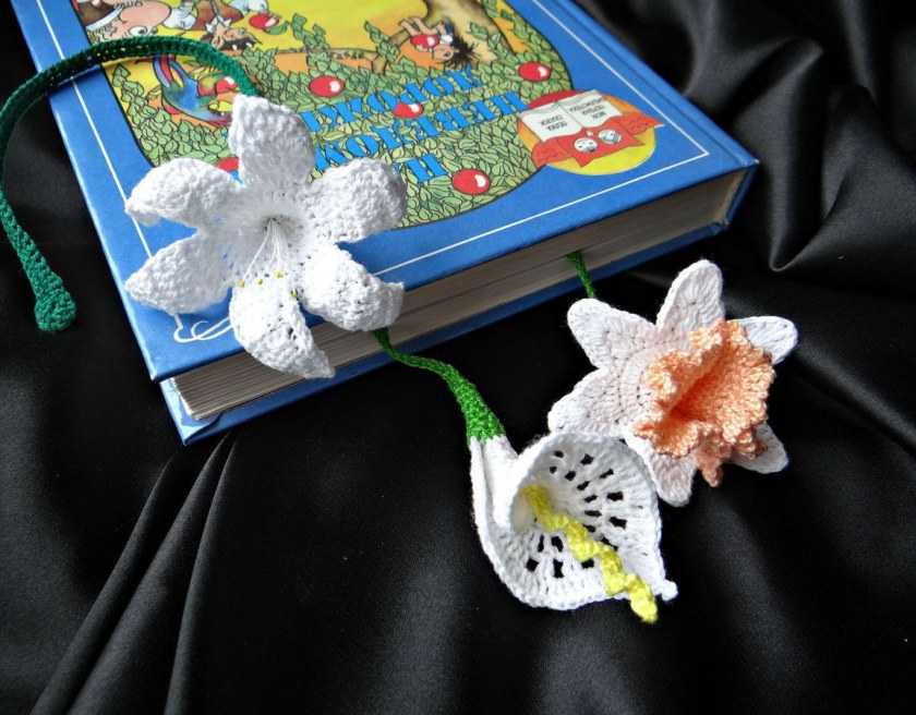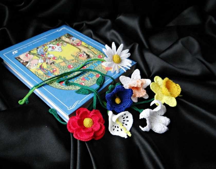 Вязаные цветы на гибких стеблях — утонченные и невероятно красивые закладки для книг. Они станут приятным подарком для подруги или родственницы.