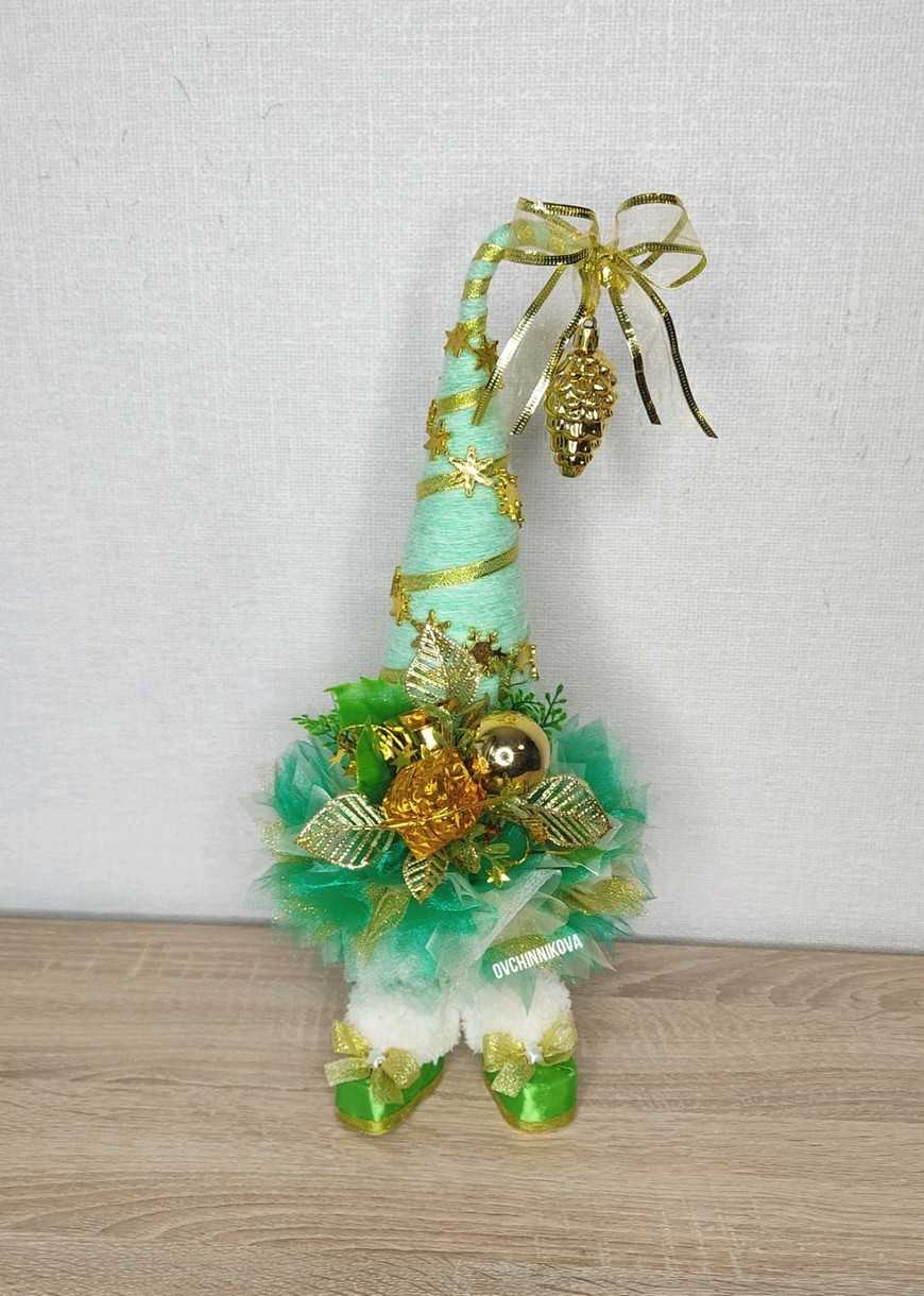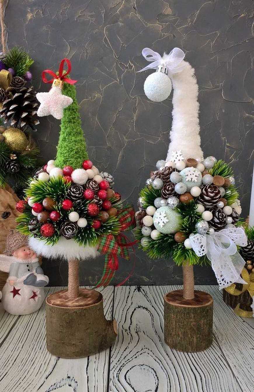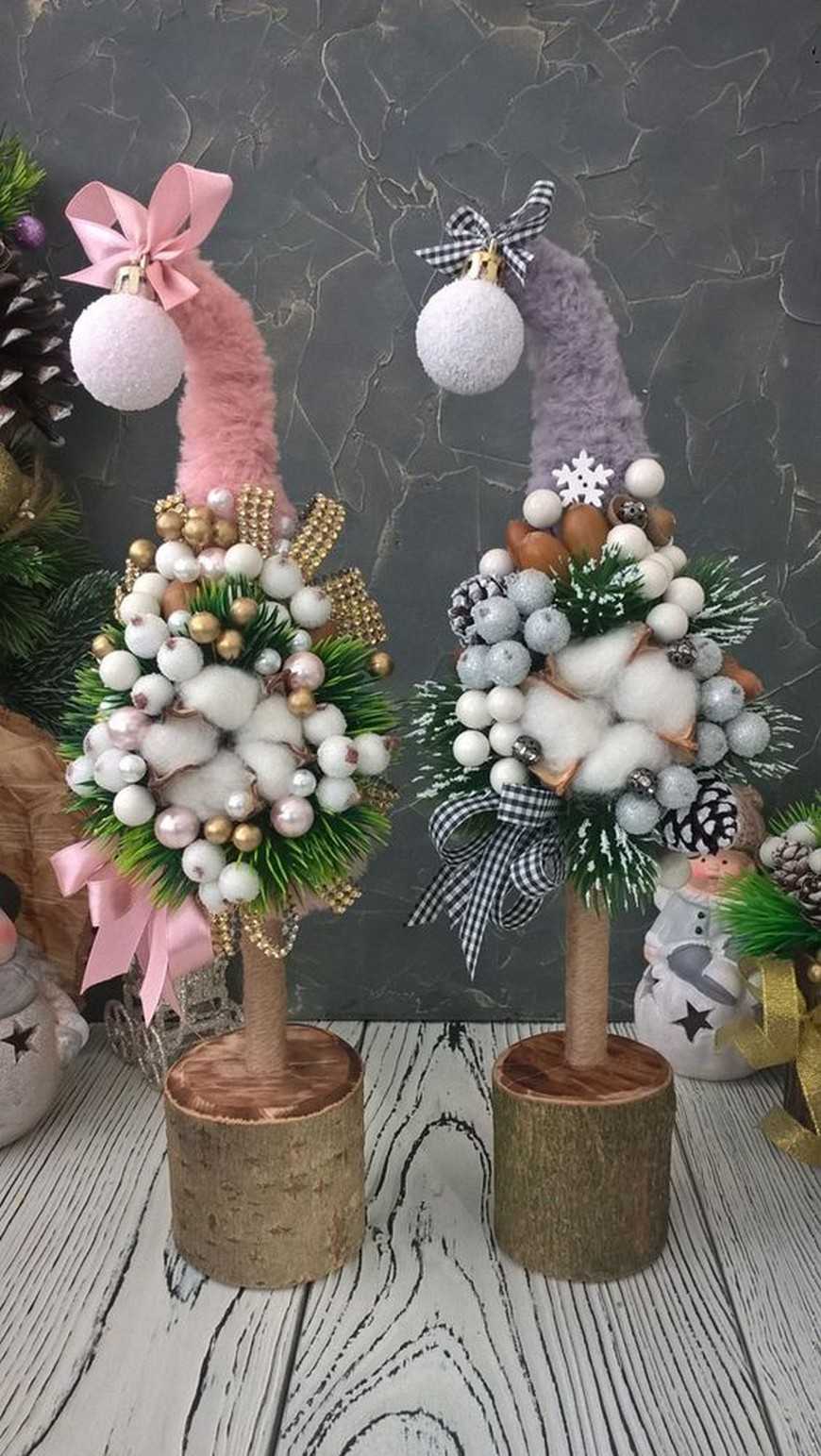 Вариантов декорирования топиариев очень много. Если вам нравится, как украшена обычная новогодняя красавица – украсьте сделанную собственноручно копию игрушками, которые вы вешаете на елку и мишурой. Для украшения подойдут и гирлянды, главное не слишком увлекаться, ведь большое количество украшений не всегда позволяют создать гармоничную композицию.
