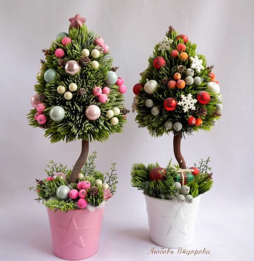 В магазинах можно увидеть топиарии, декор которых смотрится сложно. На первый взгляд кажется, что сделать такое дерево под силу только профессионалам, но это заблуждение. Своими руками можно изготовить красивую и необычную елочку, которая не будет уступать в качестве тем, что продаются в магазинах.