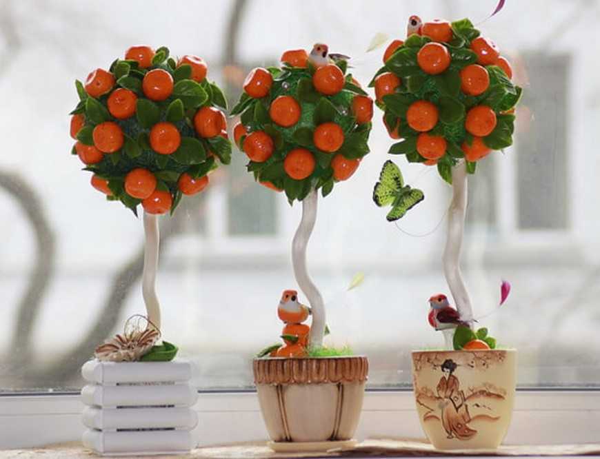 - Декоративных штрихов. Они могут возникнуть в процессе создания самой поделки. Так, на фото в источнике, по которому вы работаете, топиарий может быть одним, но вы, привнеся свои замыслы в декор, получите на выходе более совершенное деревце.