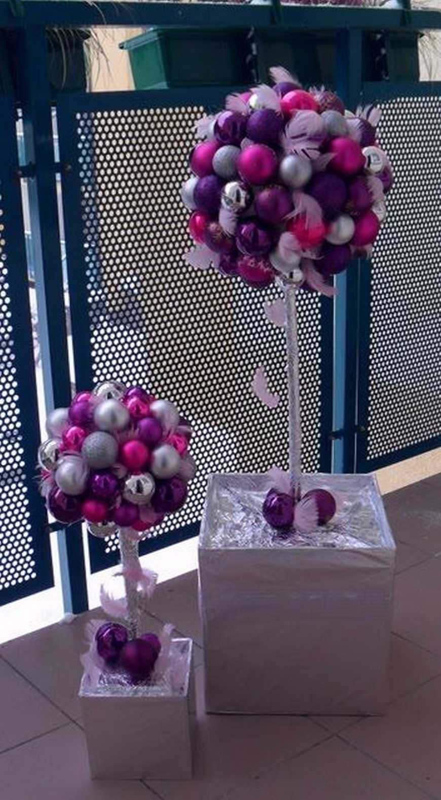 Топиарии – это не обязательно миниатюрные елочки, они могут представлять собой и небольшой высоты деревья, декорированные елочными шарами и другими украшениями.