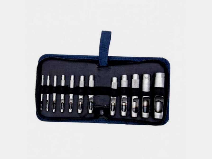 Практичный набор, позволяющий проделывать прогалины в изделиях из кожи и резины. Производится российским предприятием. Пользуется повышенным спросом благодаря соотношению цены и качества. Претензии к товару отсутствуют. Брак в продажу не поступает. Для работы необходим специальный молоточек или иной вспомогательный инструмент. При изготовлении приспособления используется прочная инструментальная сталь марки 45. Резьба получается ровной и качественной благодаря прецизионной заточке рабочих элементов. Реализуется в упаковке с параметрами 15*3*10 см.