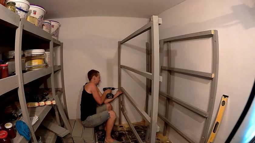 Между нижней полкой и полом необходимо оставить зазор, примерно на 5-10 см. Высота между основными рядами зависит от объёма предметов, которые впоследствии должны будут на них располагаться.